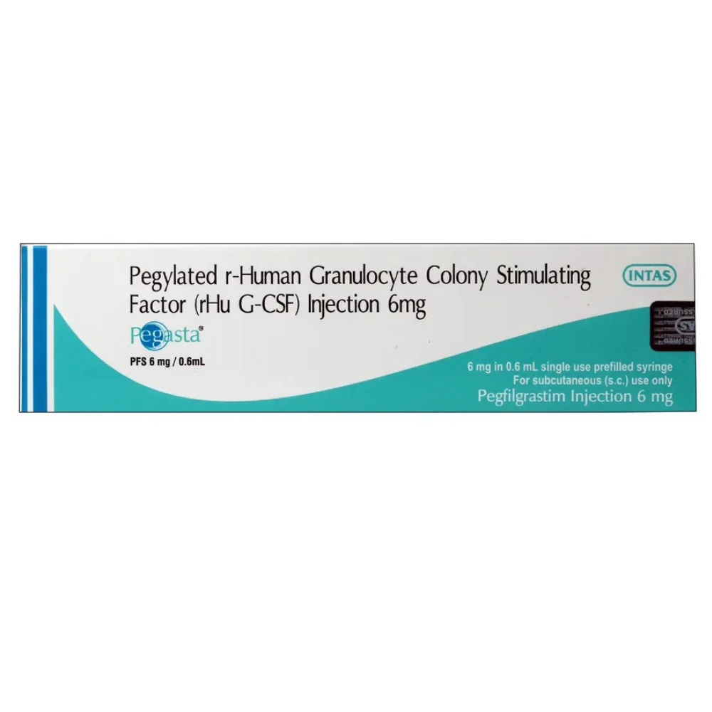 Pegasta 6 mg Injection contains Pegfilgrastim, a long-acting granulocyte colony-stimulating factor (G-CSF) that aids in reducing the risk of infection in patients undergoing chemotherapy by preventing neutropenia—a condition where white blood cell counts are low. Pegfilgrastim works by stimulating bone marrow to produce more white blood cells, bolstering immune health and minimizing infection risks during cancer treatment. This medication is typically administered under medical supervision.