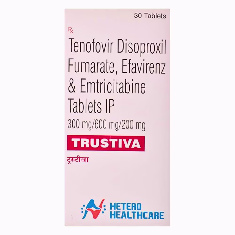 Trustiva Tablet contains a combination of Efavirenz, Emtricitabine, and Tenofovir Disoproxil Fumarate, used as an antiretroviral medication to manage and treat HIV-1 infection. This combination works by preventing the virus from multiplying in the body, thereby reducing the viral load and helping maintain a stronger immune system. Trustiva is commonly prescribed for long-term management of HIV in adults and adolescents.